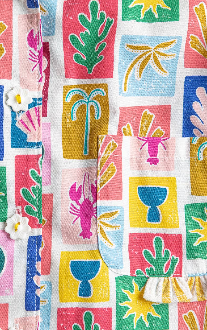Greetings from a sunny vacation! Grab the perfect souvenir to remember the trip with the Postcard Top. This cotton poplin style features an island, holiday-inspired print with whimsical icons to remind you of the sun, sea, and shore. It’s topped with white flower-shaped buttons on a cool collared lapel, a pocket on the chest, and finished with gathered elastic sleeves. Pop on the Tennis Skort for a playful pairing!