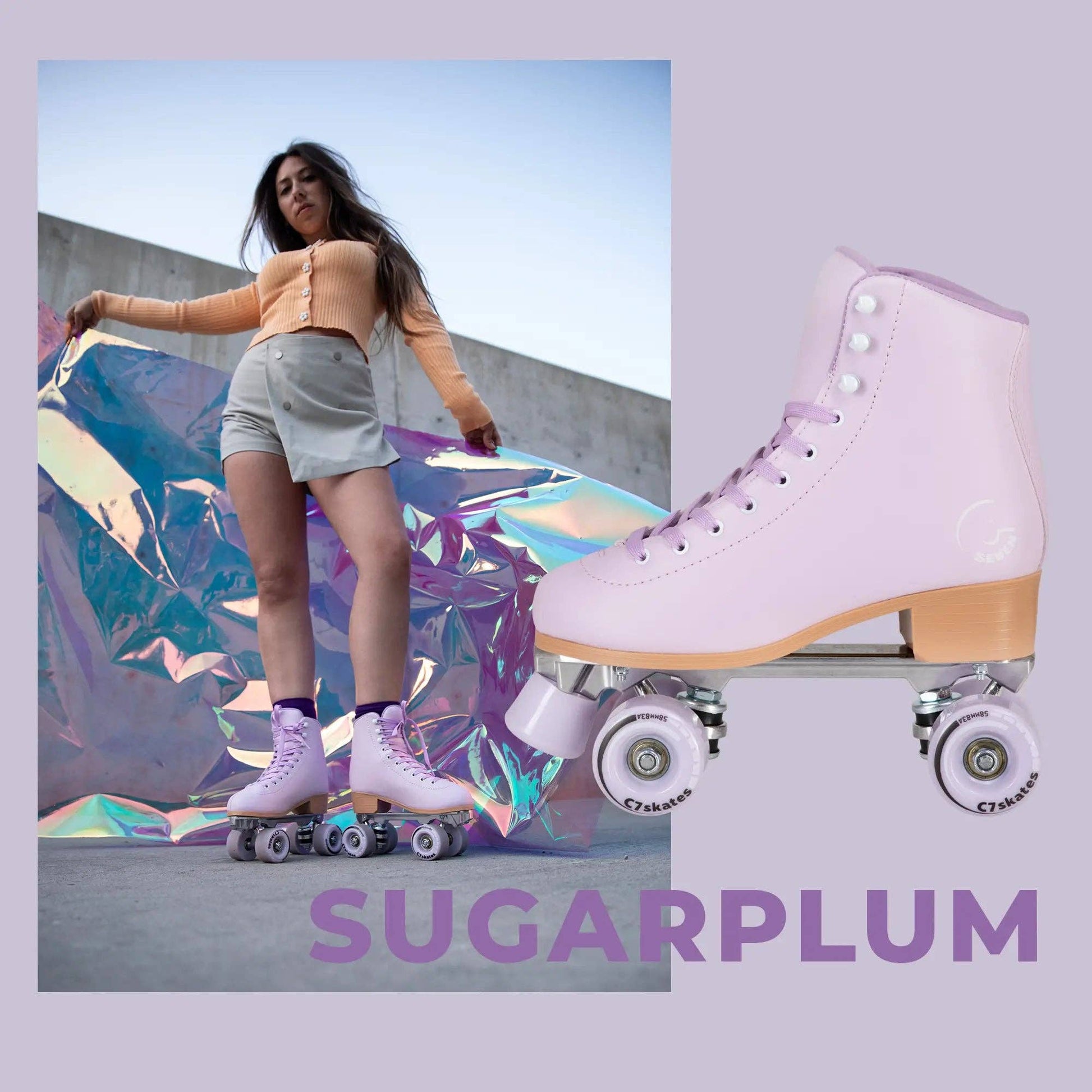 Airy and sweet, the Sugarplum Quad Skates from the Forget Me Not collection are everything you need for fast speed! The structured retro boot is made with vegan leather in a gorgeous pastel purple shade with a plush interior to give you comfy ankle support all day long. Constructed with lightweight aluminum trucks and featuring monochrome 58mm 83A wheels with ABEC-5 carbon steel bearings for a smooth roll. Such a darling pair, they’re simply unforgettable!